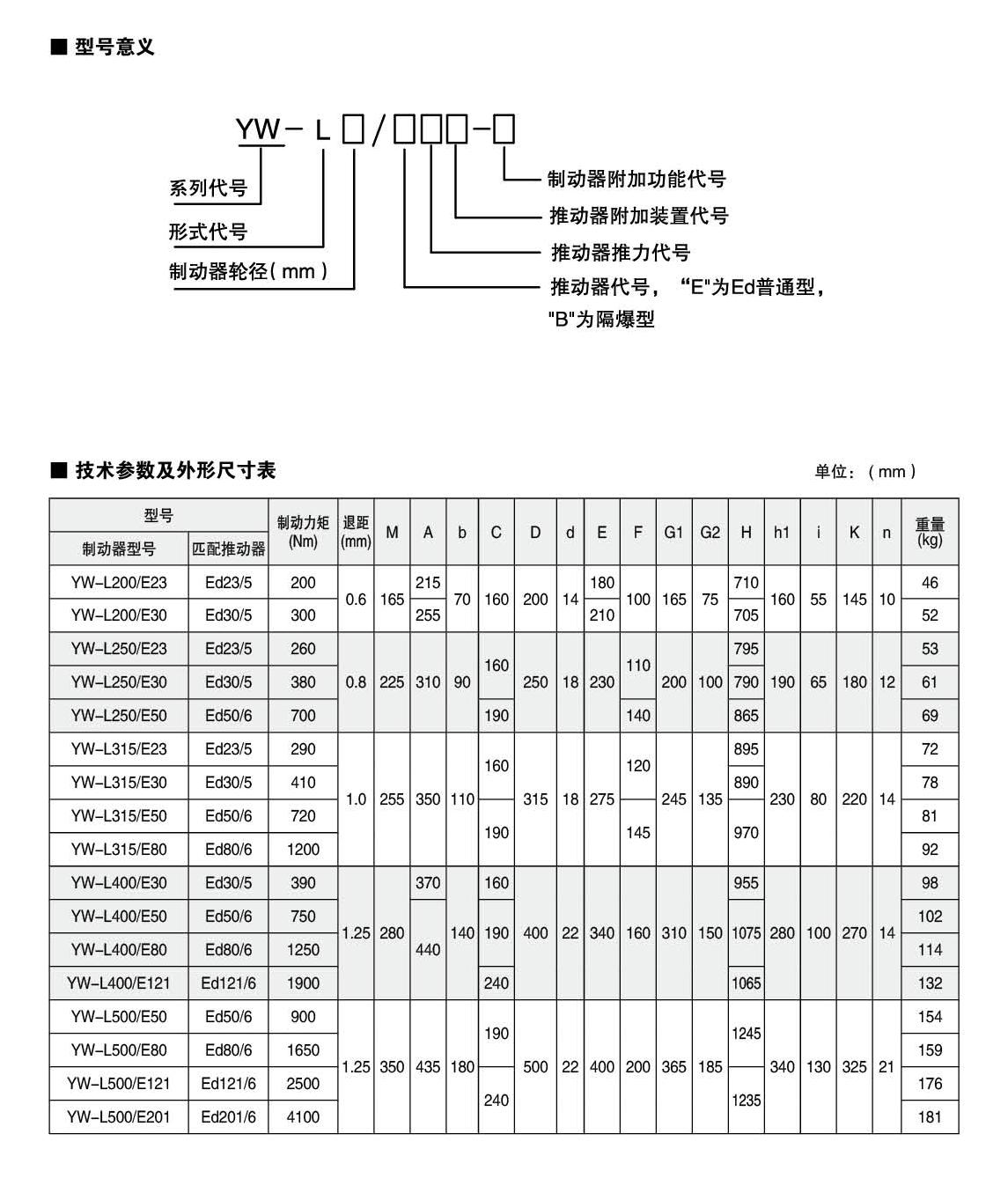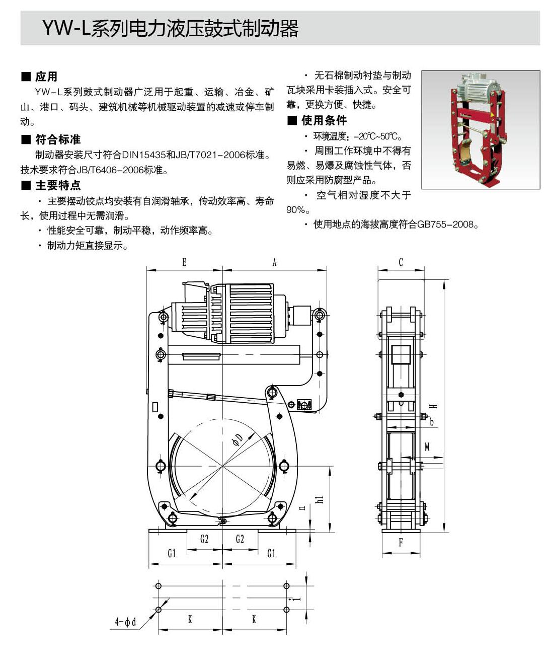 YW-L系列制動器連接尺寸及制動力矩參數符合JB/T6406-2006標準和DIN15435標準。配套符合DIN15430標準的Ed系列推動器。