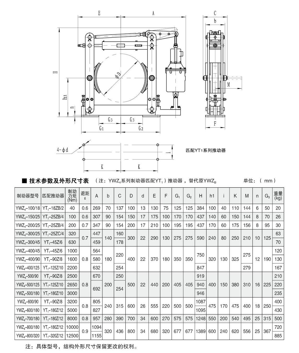 YWZ(YT1)系列電力液壓鼓式制動器的連接尺寸和制動力矩參數符合JB/ZQ4388-86標準,技術要求符合JB / T6406-2006標準。